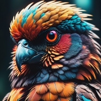 colorful plumage with shades of blue, green, yellow, and orange. The bird appears to be a crested cockatoo or another similar species known for its elaborate feathering and curled beak. It is facing the viewer directly with its eyes open and head turned slightly to one side. The background is neutral in color, providing a contrast that emphasizes