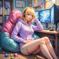На картинке запечатлена молодая женщина с светлыми волосами, на голове у неё наушники, она сидит перед компьютером с несколькими мониторами. На ней удобная одежда: фиолетовый худи поверх белой футболки. По её позе можно предположить, что она расслаблена или занята играми или трансляцией контента на своих устройствах. Комната оформлена в уютной и красочной обстановке, вокруг разбросаны книги, а небольшое окно пропускает свет.