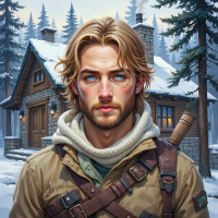 The image depicts a man standing in a snowy landscape. He has light skin and short, blonde hair. His expression appears serious as he looks directly at the viewer. The man is wearing a winter jacket with a fur-lined hood, suggesting cold weather conditions. Around his neck, there are what appear to be leather straps or bracers. In front of him is a small wooden cabin with a snowy roof and chimney smoke coming from it. The surroundings include evergreen trees and a clear sky with no visible clouds, indicative of a cold winter day. The ground is covered in untouched white snow.