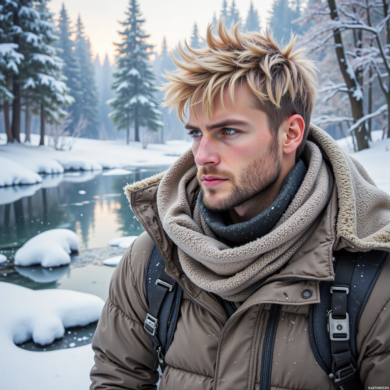 На картинке молодой человек стоит посреди зимнего пейзажа. На нём тёплая одежда, подходящая для холодной погоды: бежевая куртка с меховым капюшоном и шарф, повязанный на шее. Шарф добавляет яркий акцент в его образ, контрастируя с преобладанием нейтральных тонов. Похоже, действие происходит в парке или на тропе в местности, где выпадает много снега – об этом свидетельствуют деревья и земля, покрытые белым ковром. Небольшой ручей извивается по всей сцене, его поверхность частично укрыта снегом. Человек стоит на берегу этого ручья, глядя вдаль с задумчивым выражением лица. Его поза говорит о том, что он, возможно, наслаждается тихой красотой природы или ищет уединение в спокойной зимней обстановке.