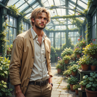 На картинке молодой человек стоит в центре домашней оранжереи. На нём светлая бежевая куртка, хаки и бежевая рубашка. У мужчины короткие светлые волосы, и он смотрит в сторону, не на зрителя. Оранжерея утопает в зелени множества растений, создавая пышный фон. Слева видны арочные окна, через которые проникает естественный свет. Горшки с растениями расставлены по всей площади, усиливая зелёный цвет. В целом, картинка передаёт атмосферу спокойствия и умиротворения.