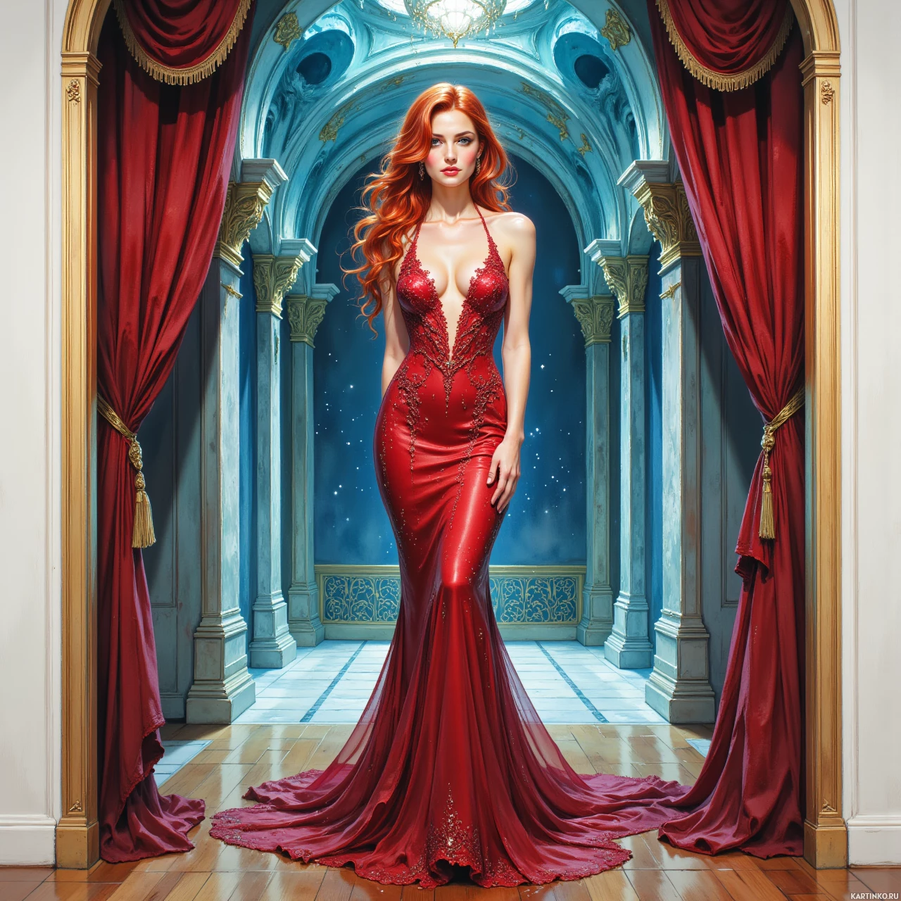 На картинке запечатлена женщина, стоящая в роскошной комнате, оформленной в древнем или средневековом стиле. Готические арки и замысловатые детали на стенах создают атмосферу старины. На ней длинное красное платье с глубоким декольте, подчеркивающее изысканность и ассоциирующееся с люксовой модой и особыми случаями. Яркий рыжий цвет ее волос гармонирует с нарядом. Стиль картинки навевает сказочные или исторические мотивы, как в исторических фильмах и повествованиях.