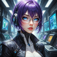 The image features a stylized female character with purple hair wearing headphones and glasses. She has a neutral expression on her face and is looking directly at the viewer. Her attire includes a dark jacket with visible metallic or tech-themed details, possibly suggesting she's in a futuristic setting or part of a technologically advanced culture. The background appears to be an industrial or high-tech environment, with multiple screens displaying various data and graphics.