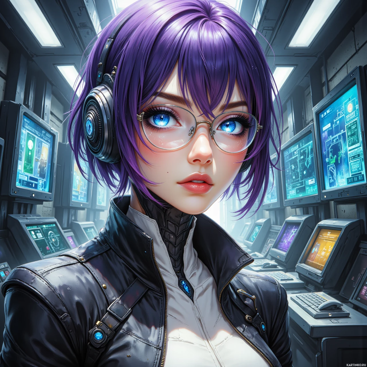 На картинке изображена стилизованная девушка с фиолетовыми волосами, в наушниках и очках. У нее нейтральное выражение лица, и она смотрит прямо на зрителя. На ней темная куртка с заметными металлическими или технологичными деталями, возможно, намекающими на футуристическую обстановку или принадлежность к технологически развитой культуре. Фон выглядит как промышленная или высокотехнологичная среда с множеством экранов, на которых отображаются данные и графика.