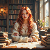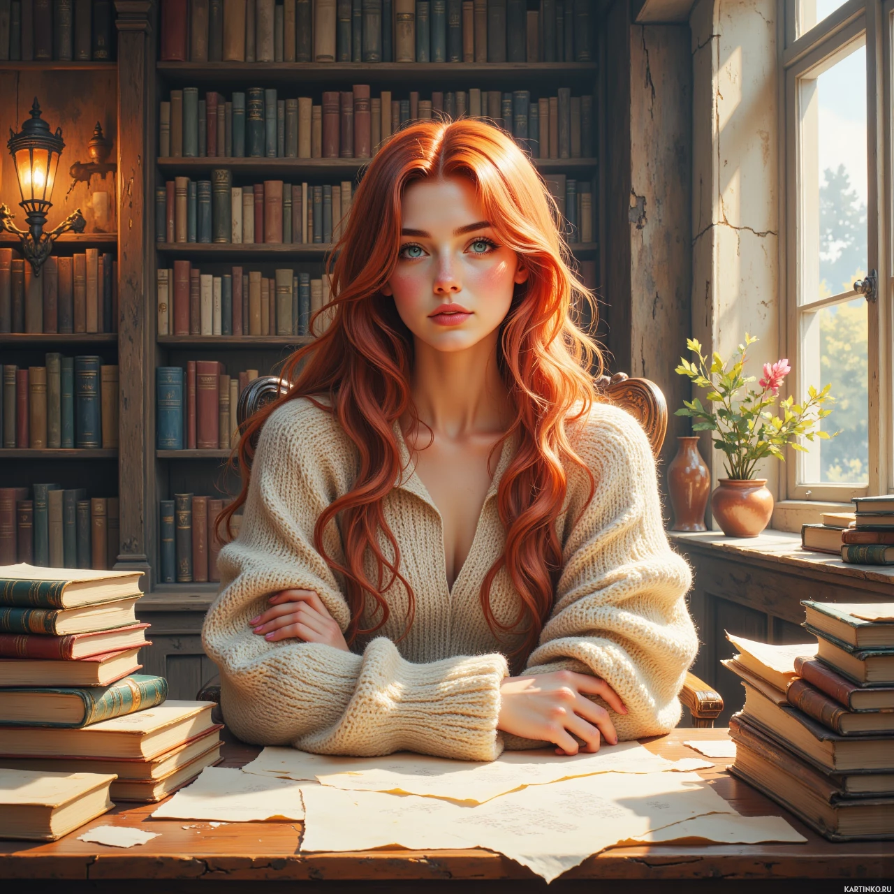 На картинке изображена женщина с рыжими волосами, сидящая за столом, заваленным стопками книг. На её лице задумчивое выражение, и она будто смотрит в сторону от зрителя. На ней кремовый свитер, а руки скрещены на груди. На заднем плане – книжные полки, полные книг, и окно, через которое проникает естественный свет. На столе стоит ваза с цветами, добавляющая красок и оживляющая сцену.