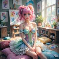 The image depicts a female character with pink hair styled in long twin tails with bows, and her eyes are blue. She has a youthful appearance, with rosy cheeks. The character is wearing an elaborate costume that includes a corset bodice with puff sleeves, a skirt with multiple layers and ruffles, and a top hat adorned with feathers and a large bow. The setting appears to be a cozy indoor room with wooden floors and walls, decorated with various artworks hanging on the wall, plants in pots, and open windows that let in natural light. There is also a desk in the background with some items and a chair. The style of the image is detailed and colorful, evoking a whimsical or fantasy atmosphere.