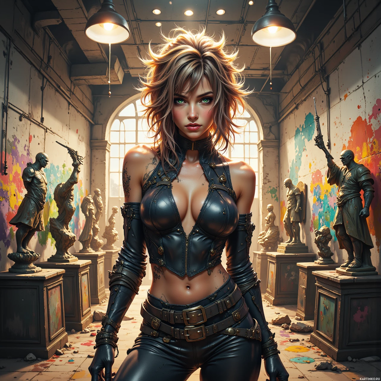 На картинке изображена женская героиня в стилизованном цифровом формате. У неё короткие каштановые волосы с лёгкими блонд-прядями, она одета в чёрную кожаную броню, включающую топ-корсет и брюки в тон. Выражение лица нейтральное, взгляд направлен немного в сторону. Действие происходит в интерьере с каменными стенами, большим окном, впускающим естественный свет, и красочным хаосом абстрактных брызг краски, покрывающих пол и нижнюю часть стен, что создаёт ощущение яркой и творческой атмосферы. По комнате разбросаны несколько скульптур, похожих на фигуры людей с преувеличенными чертами, добавляющие в сцену художественный или сюрреалистичный элемент. В целом, стиль картинки напоминает дизайн персонажей для видеоигр, с акцентом на реализм и внимание к деталям в текстурах и освещении.