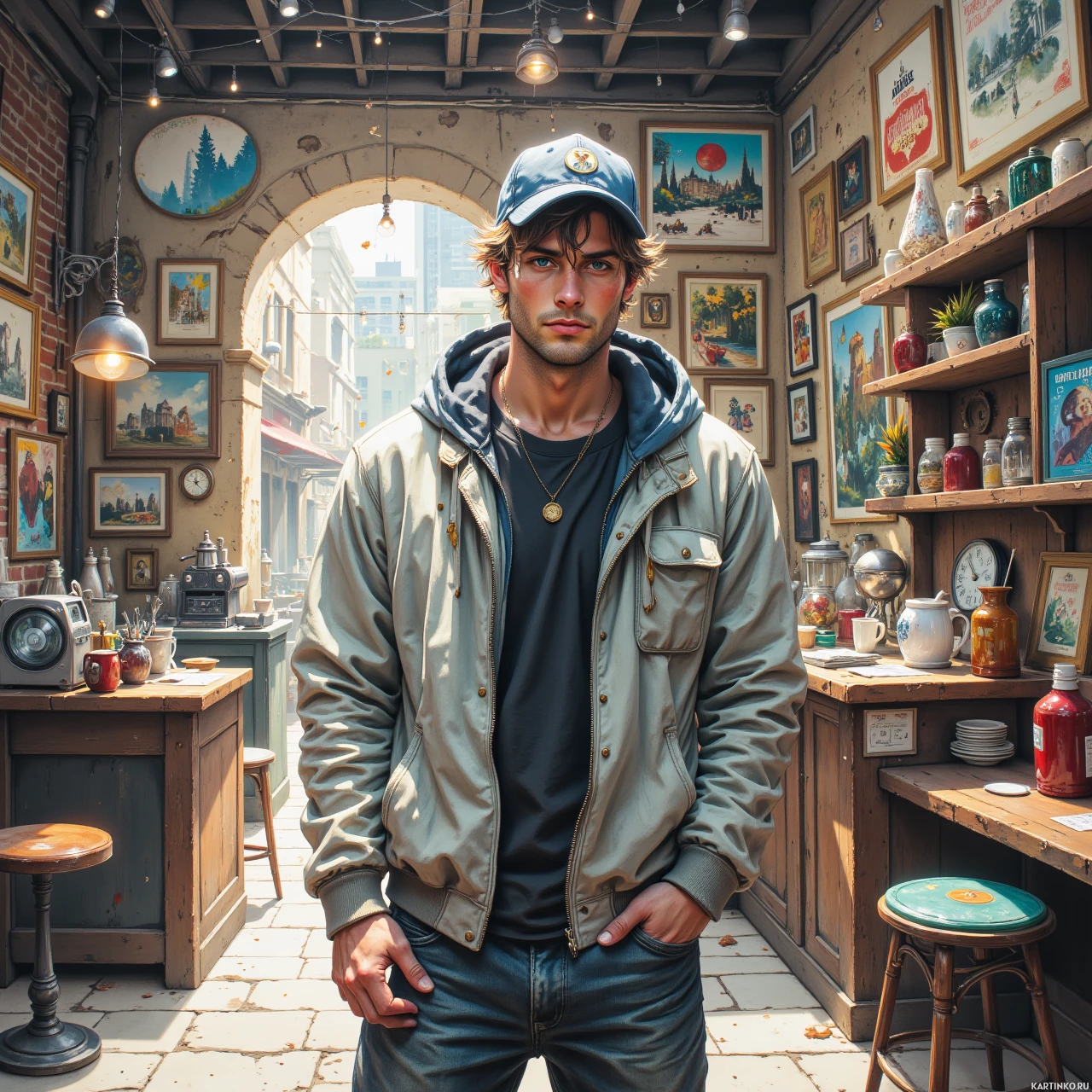 На картинке запечатлен молодой человек, стоящий в помещении, которое похоже на комнату, заставленную разными предметами и произведениями искусства. На нём куртка поверх рубашки с длинным рукавом, джинсы и ботинки. У мужчины серьёзное выражение лица, и он смотрит прямо в камеру. За ним видны полки с рамками и то, что похоже на старинное радио или устройство. В комнате царит атмосфера старины: кирпичные стены и арочные окна пропускают естественный свет.