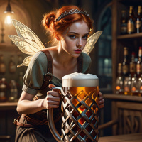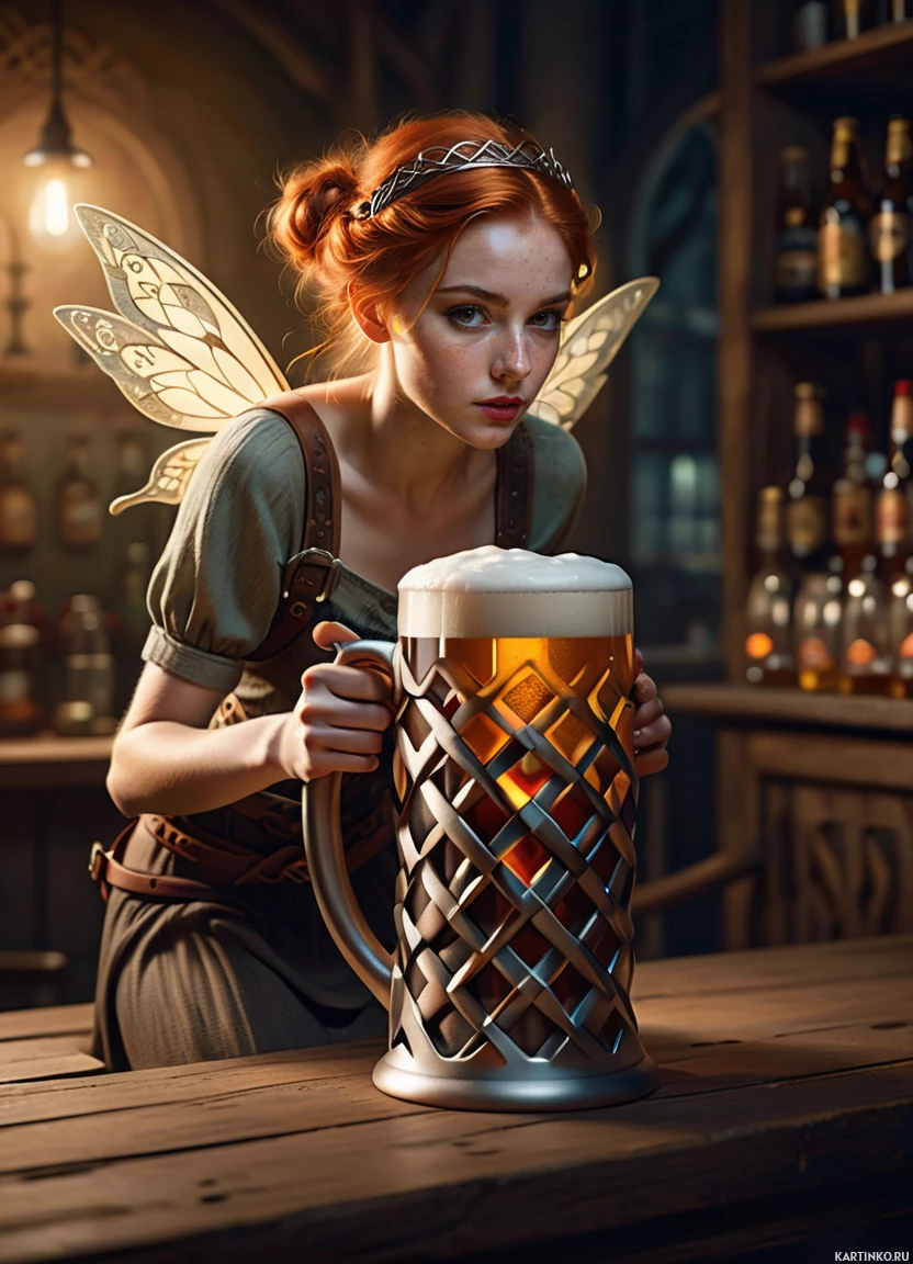 In this image, there is a red-haired fairy wearing a medieval-style dress and wings. She is holding