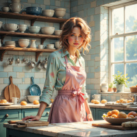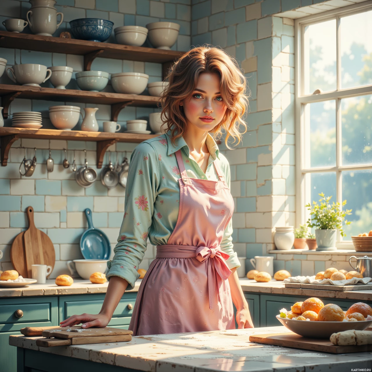 На картинке молодая женщина стоит на залитой светом кухне, взгляд её направлен за пределы кадра. На ней розовый фартук, а на рубашке – цветочный узор. На кухонном столе – разнообразие выпечки: торты и пирожные. На стене за ней – полки, заполненные посудой, а солнечный свет, льющийся из окна, освещает всю сцену.