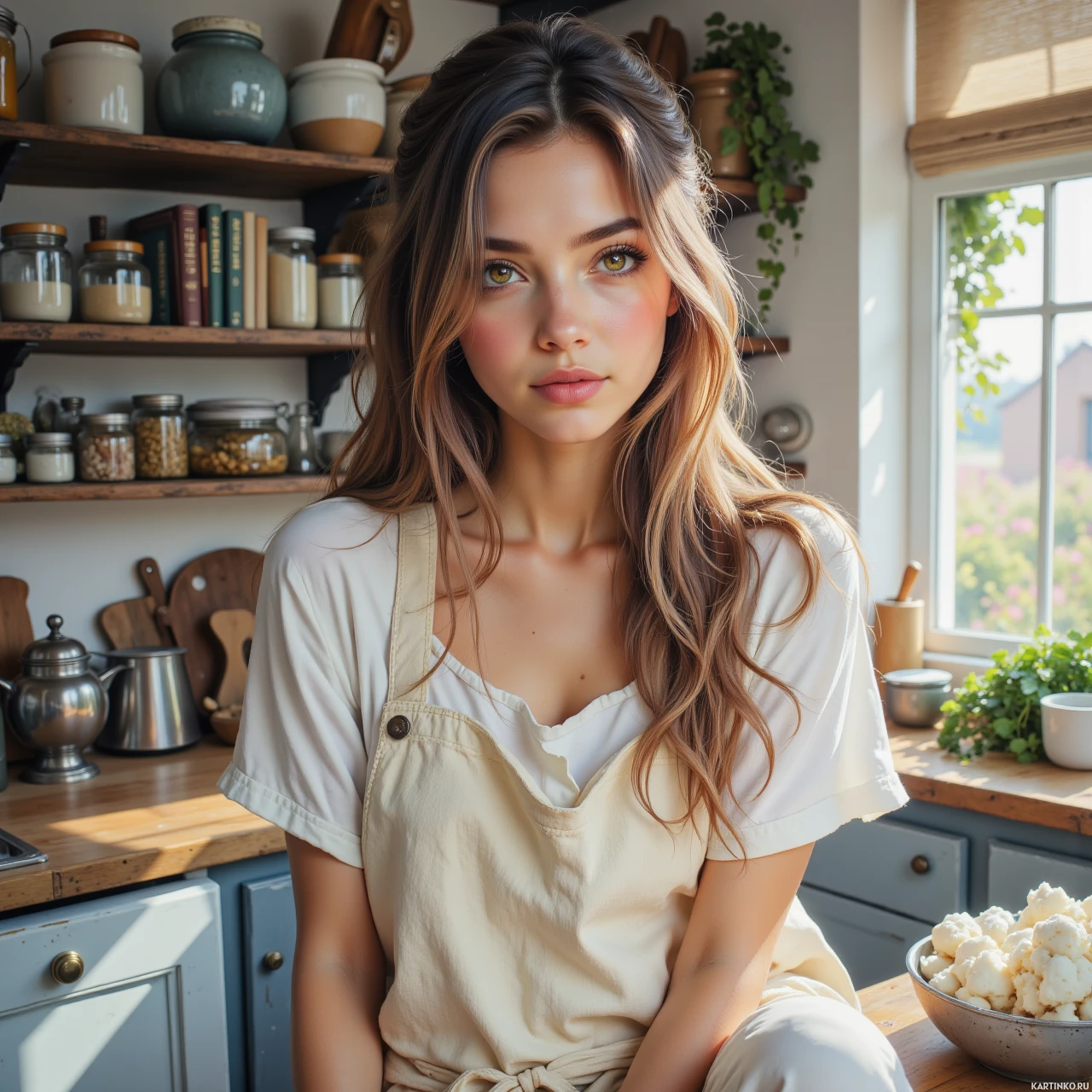 На картинке молодая женщина сидит, видимо, на кухне. У нее длинные каштановые волосы, и она одета в фартук поверх светлой блузы. Она сидит непринужденно, одна рука лежит на бедре, а другая нежно касается лица. У нее спокойное выражение лица. На заднем плане - полки с кухонными принадлежностями: книгами рецептов, банками со специями и, возможно, бутылками с маслами или уксусом. Слева от картинки открытое окно, откуда льется дневной свет, что говорит о том, что сейчас день.