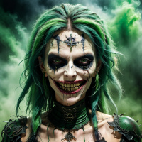The image features a figure with distinct makeup that resembles the character of the Joker from the Batman series, known for his grinning face and green hair. This figure is styled in a dark fantasy theme with gothic elements such as piercings, chains, and dark clothing. The background has a moody, cloudy sky that complements the eerie atmosphere of the image.