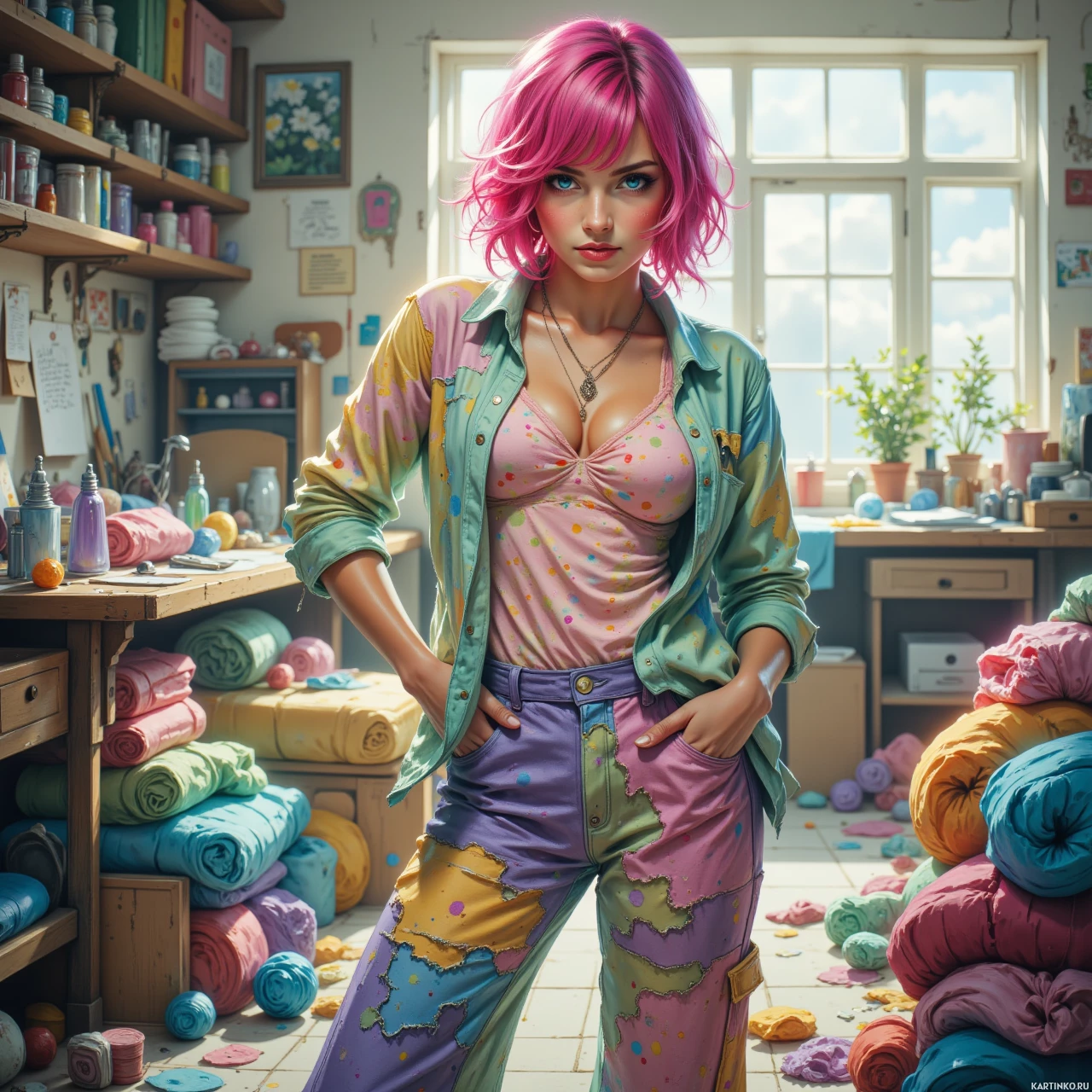 В картинке человек стоит в комнате, заставленной разнообразными товарами для рукоделия. У него розовые волосы и яркая одежда: куртка украшена разноцветными заплатами. Он стоит, положив правую руку на бедро, а левую слегка подняв. На заднем плане – многочисленные полки с красками, тканью и инструментами для творчества. Комнату заливает яркий солнечный свет из окна справа.