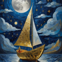 nighttime scene with a large sailboat floating on calm water. The boat has multiple sails and appears to be at rest, possibly moored for the night or anchored in