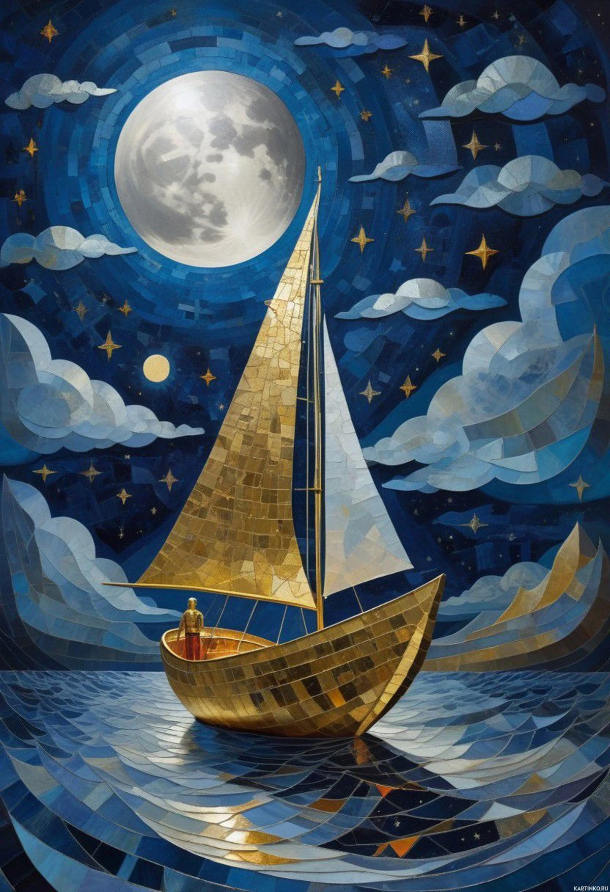 shallow waters near a beach. Above the boat, a full moon is visible against a star-studded