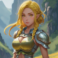 a female character with blonde hair and pointed ears, indicative of an elf fantasy theme. She is dressed in armor consisting of a breastplate and greaves, which suggests she might be a warrior or a guardian type within the context of this