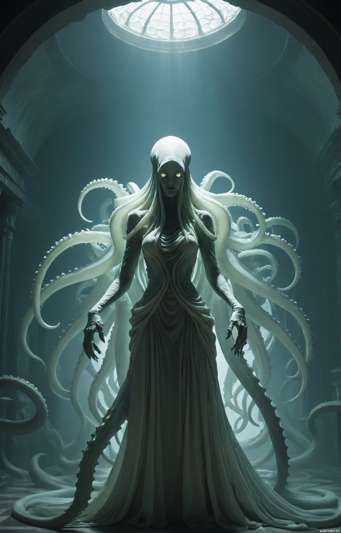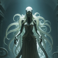 an ethereal atmosphere, with one large light source illuminating the character from above, casting shadows and highlights on their armor and dress. Overall, the image is richly detailed, conveying