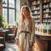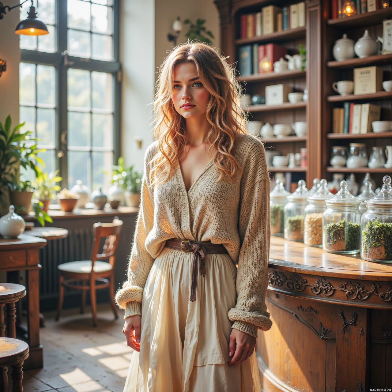 На картинке – женщина с длинными светлыми волосами стоит в помещении, похожего на кафе или магазин с полками, заполненными разнообразными предметами. На ней – светлый вязаный свитер и платье, которое небрежно спускается с одного плеча, оставляя другое открытым. Она смотрит в сторону, на её лице – спокойное выражение. В интерьере – деревянная мебель и полки, заставленные книгами и декоративными вещами. Естественный свет из окон освещает пространство, отбрасывая мягкие тени и подчеркивая теплые оттенки дерева и тканей.