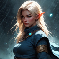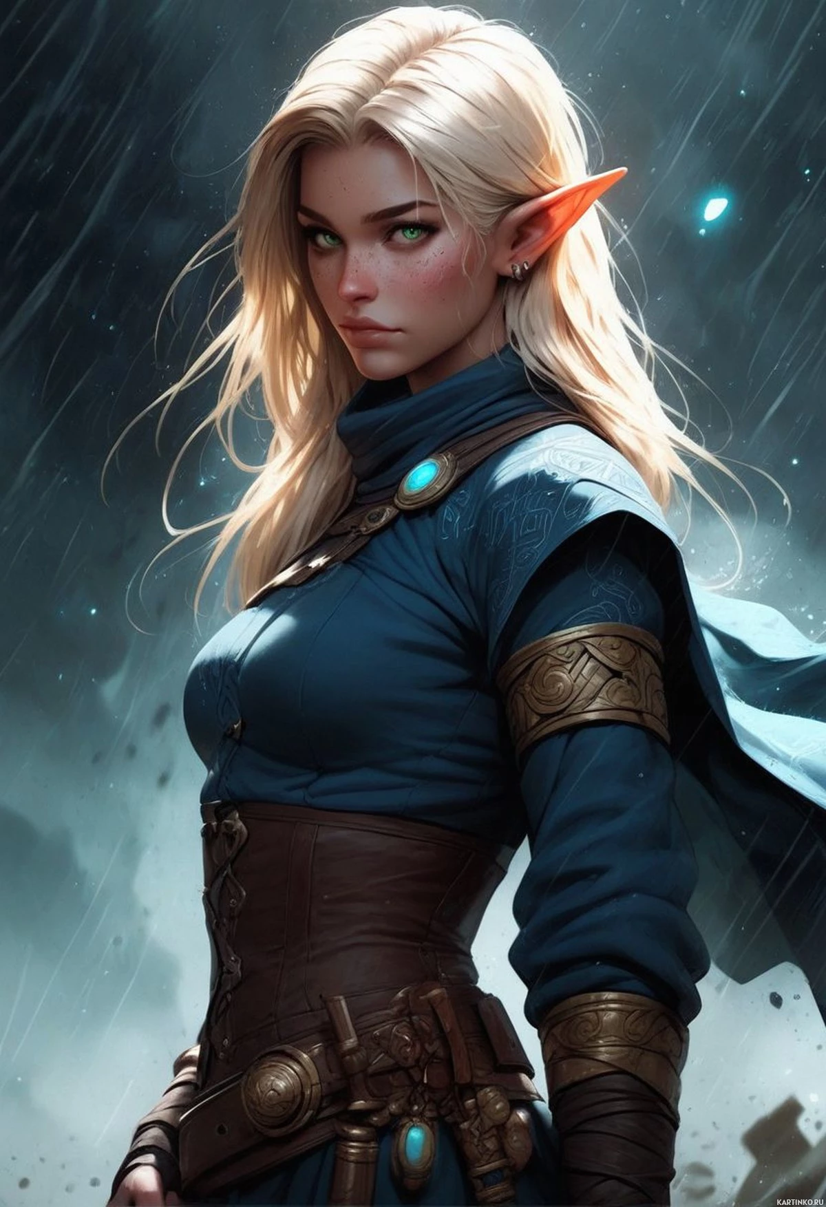 blonde hair, pointed ears indicative of an elven race, and is wearing a blue tunic with leather accents. She also has what seems to be a sword attached to her belt. Her expression is serious, and she is looking directly at the viewer. The background suggests a dark and stormy atmosphere, which contrasts with the character's attire and demeanor.