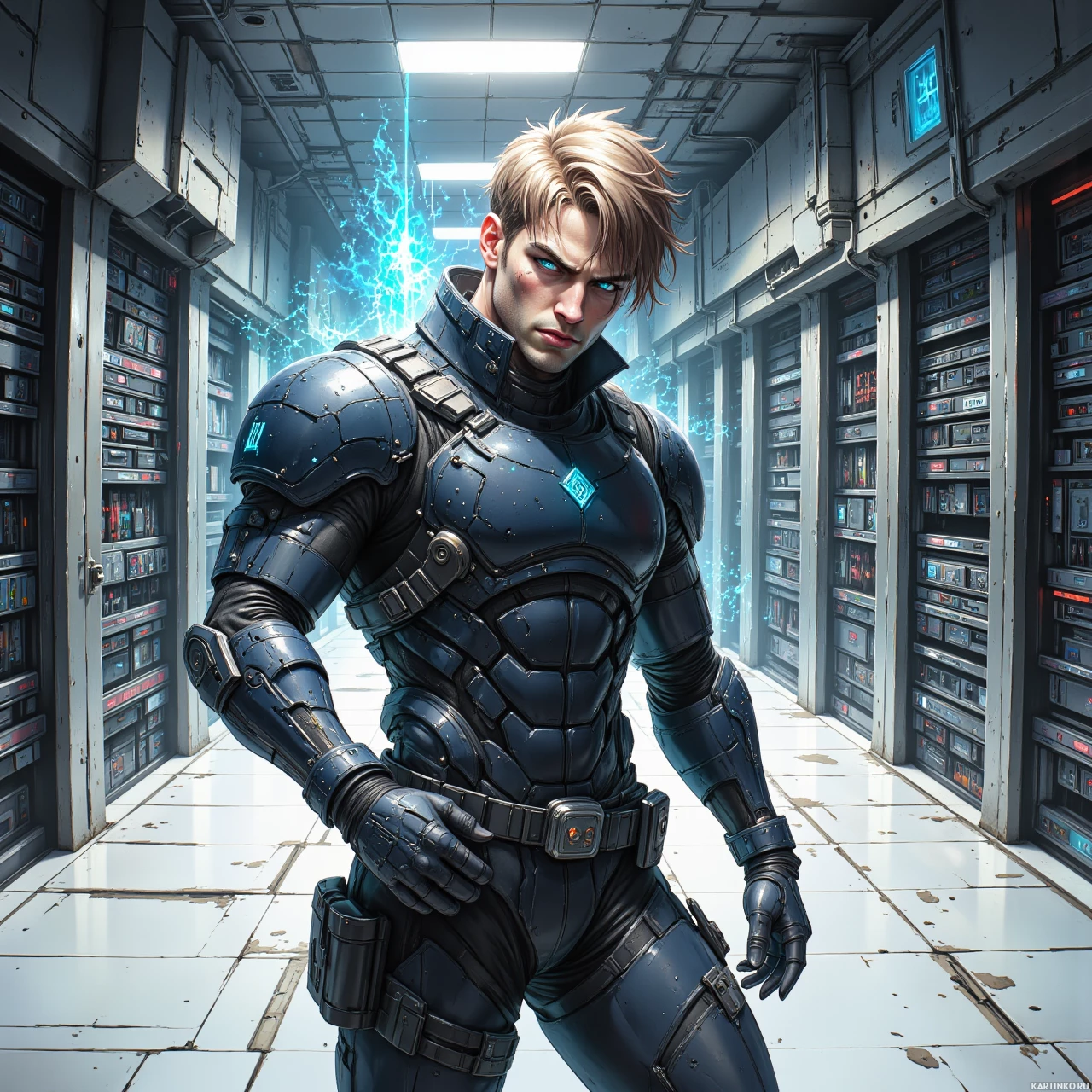 На картинке изображен персонаж мужского пола в футуристической броне, находящийся в индустриальной или технологически продвинутой среде. Он стоит прямо, одна рука у бедра, другая свободно опущен. На нем облегающий металлический костюм со шлемом, оснащенным визорами, что указывает на защитную или боевую функцию. Броня детализирована, видны панели и секции, подчеркивающие её функциональность и прочность. Вокруг него – индустриальная обстановка с рядами высокотехнологичного оборудования, возможно, серверы или механизмы, судя по стеллажам, заполненным устройствами. Освещение искусственное и направленное, создающее ощущение глубины.