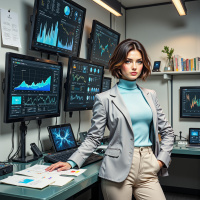 In the center of the image, a young woman stands confidently with her hands resting on her hips. She is dressed in professional attire, consisting of a gray blazer over a white top and khaki pants. Her gaze is directed straight at the camera, conveying an air of self-assurance. Behind her, a wall lined with multiple monitors displays various charts and graphs. The screens are illuminated with data that includes stock market trends and performance metrics. Scattered around the room are books and papers, suggesting an environment of learning or analysis. On the left side of the image, there is a potted plant adding a touch of greenery to the otherwise tech-focused setting. The overall atmosphere suggests a blend of technology and business intelligence.