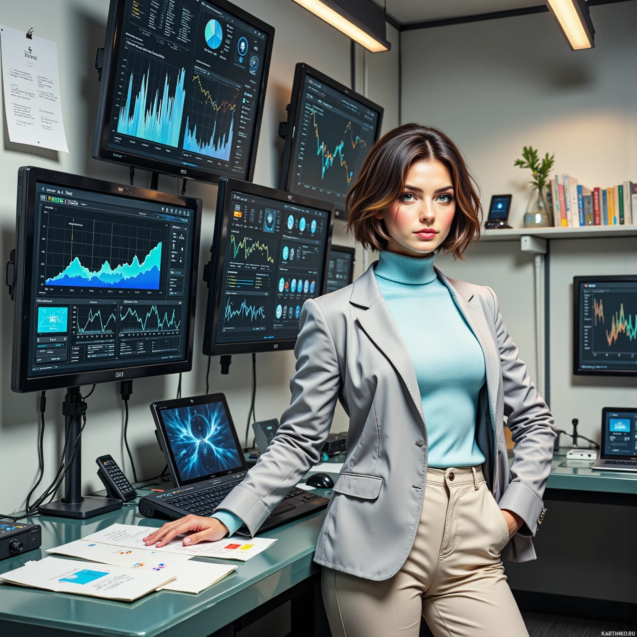 В центре картинки молодая женщина уверенно стоит, положив руки на боки. На ней профессиональный костюм: серый блейзер поверх белой блузки и хаки. Её взгляд направлен прямо в камеру, излучая уверенность. Позади неё стена, уставленная мониторами, на которых отображаются различные графики и диаграммы. На экранах – данные о тенденциях на фондовом рынке и показатели эффективности. В комнате разбросаны книги и бумаги, что говорит об обстановке, располагающей к обучению или анализу. Слева в кадре – комнатное растение, добавляющее немного зелени в и без того технологичную обстановку. В целом, атмосфера наводит на мысль о сочетании технологий и бизнес-аналитики.