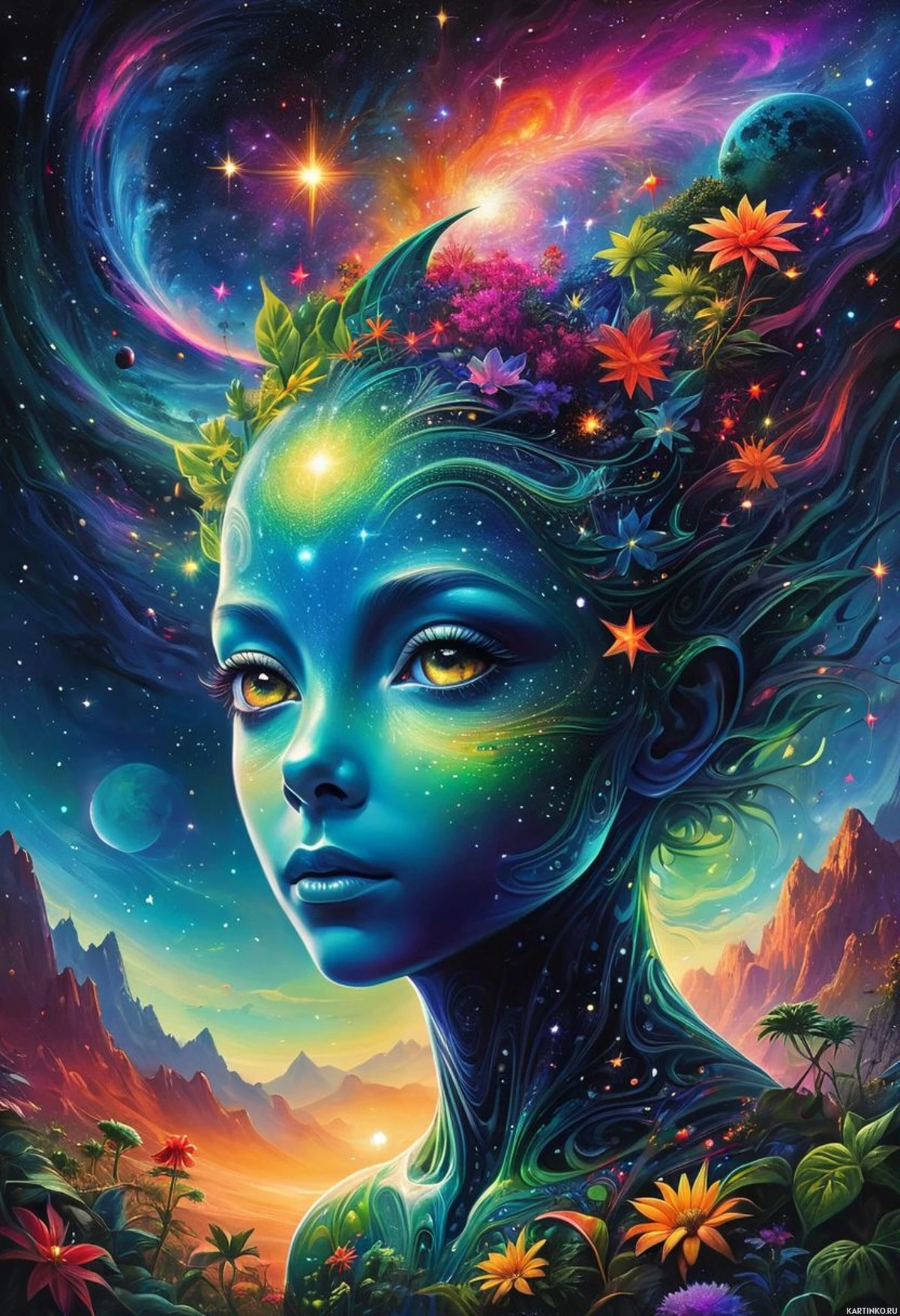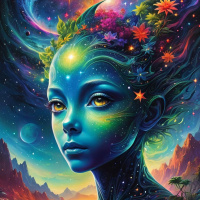 a small bird perched on her nose. The overall color palette is rich in blues, purples, and greens, which may suggest a connection with nature or the cosmos. The background of the image is fantastical as well, featuring dramatic landscapes that seem otherworldly with towering mountains under