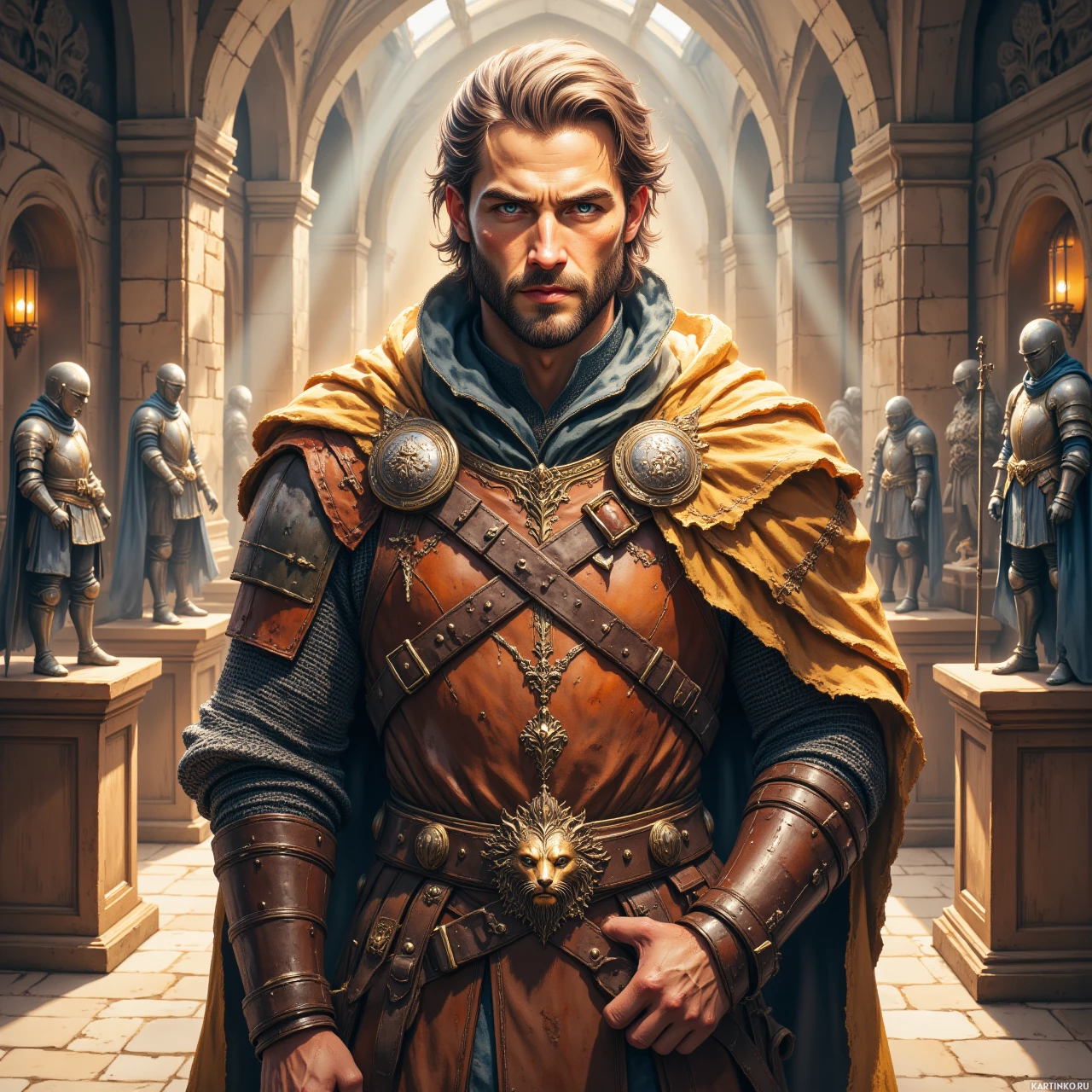 На картинке изображен мужчина, стоящий в центре помещения с арочными каменными потолками и колоннами, создавая ощущение величественного зала или замкового двора. Он одет как воин, по всей видимости, из эпохи Древнего или Средневекового мира. На нем коричневая кожаная нагрудная броня поверх туники с длинными рукавами, украшенной металлическими заклепками, что указывает на высокий статус или значимость. Вокруг шеи висит крупная золотая цепь или медаль, которую он держит одной рукой у груди. У него волосы длиной до плеч, уложенные в стиле, соответствующем изображенной эпохе – возможно, коса или хвост. На его лице серьезное выражение, и он смотрит прямо на зрителя. Его одежда включает кожаные элементы брони и декоративные пряжки с замысловатым узором, характерные для моды той эпохи. Общий стиль картинки – реалистичный, с акцентом на детализацию текстур и материалов, из которых сделана его броня, чтобы подчеркнуть подлинность.