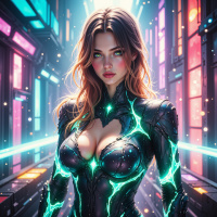 In the image, a woman with long brown hair stands in front of a vibrant background. She wears a black and blue bodysuit that appears to be made of a futuristic material, possibly armor given its form-fitting design and the visible cracks across it. The suit features a high collar and detailed designs on the chest area, hinting at some sort of technological or sci-fi theme. Her expression is neutral, and her gaze is directed straight ahead.
