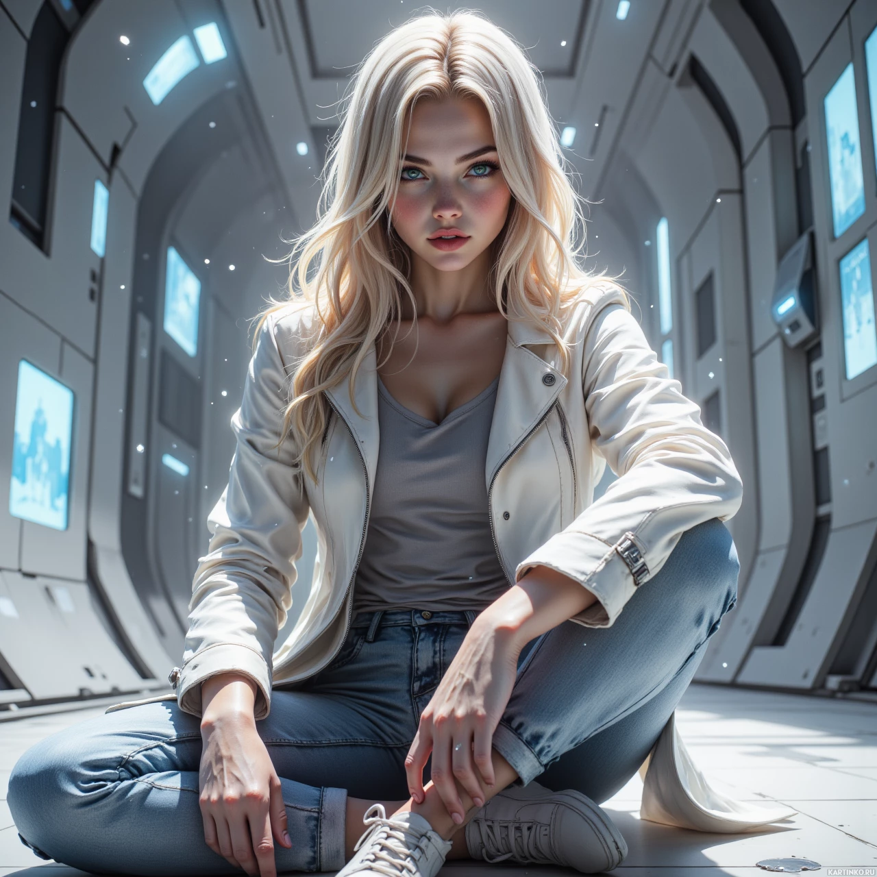 На картинке изображена женщина с длинными светлыми волосами, сидящая в футуристическом интерьере, похожем на передовую панель управления или кабину. На ней повседневная одежда: легкая куртка поверх серой футболки и джинсы. Её взгляд задумчив, она смотрит в сторону. Окружающее пространство характеризуется гладкими металлическими поверхностями, цифровыми интерфейсами с отображаемыми данными и мягким освещением, создающим почти неземную атмосферу.