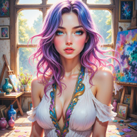 The image depicts a digital artwork of a character with purple hair and striking blue eyes, presented in a realistic style. The character is wearing a top with ornate details and has a confident gaze towards the viewer. Behind her, there's an indoor setting that appears to be an artist's workspace, with various paintings on the wall and art supplies such as vases and easels in the background. The lighting suggests it might be late afternoon or early evening, with warm natural sunlight illuminating the scene.