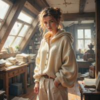 На картинке изображена женщина, стоящая в комнате, заставленной книгами и разными предметами. У нее длинные волосы, уложенные вверх, и она одета в свитер с подвернутыми рукавами. Её руки засунуты в карманы, и она смотрит в сторону, а не прямо в камеру. Окружение создает атмосферу тихой интеллектуальной деятельности или учебы.