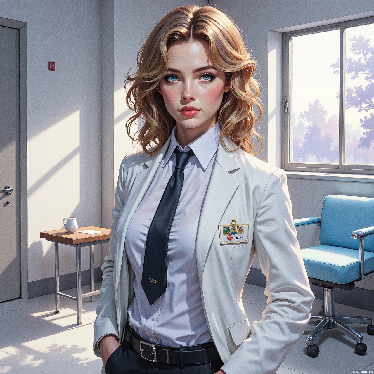 На картинке изображен стилизованный, мультяшный персонаж, похожий на молодую женщину с светлыми волосами и выразительными голубыми глазами. На ней профессиональный наряд: белый блейзер поверх белой рубашки, темные брюки и темный галстук, небрежно повязанный на шее. Выражение лица нейтральное, она смотрит прямо на зрителя. Задний план намекает на офисное помещение: виднеется окно, пропускающее естественный свет, и стол, который может служить для работы или административных задач.