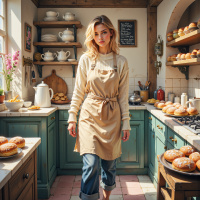 The picture features a young woman with blonde hair, who appears to be in her early 20s. She has a cheerful expression and is looking slightly to the side of the camera. She is wearing an apricot-colored apron over a knitted sweater, suggesting she might be engaged in some form of cooking or baking activity. In front of her is a kitchen counter with various pastries arranged on it, indicating that freshly baked goods are part of the scene. The kitchen has rustic wooden cabinets and shelves stocked with additional items such as bowls, cups, and other kitchenware.