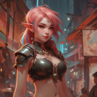 urban environment often found in fantasy worlds. The character is standing confidently, drawing attention amidst the crowd around her.