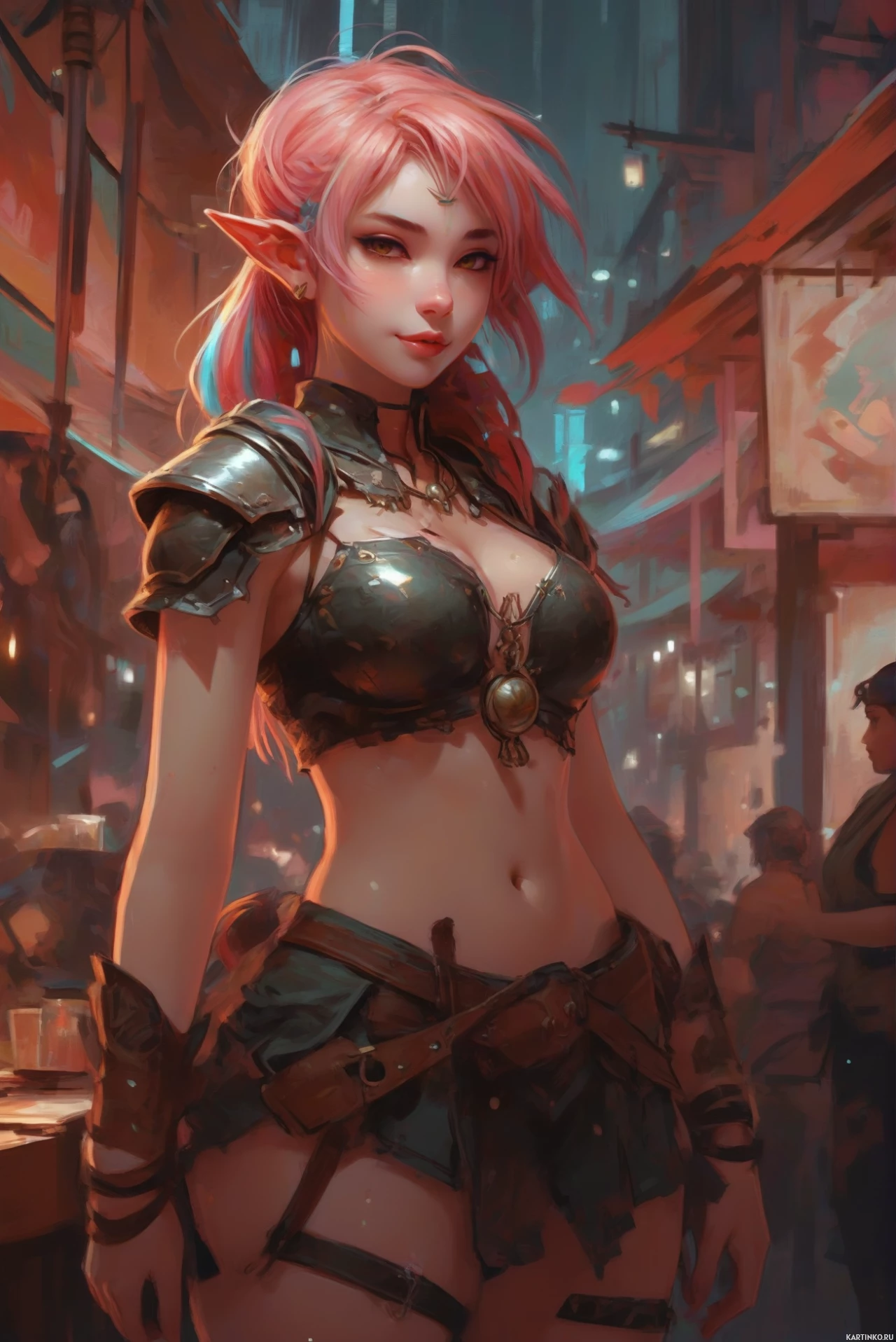 pink hair and is dressed in armor, suggesting she may be of royal status or a warrior within her fictional realm. The setting appears to be a bustling street scene with various shops and signs, hinting at a lively