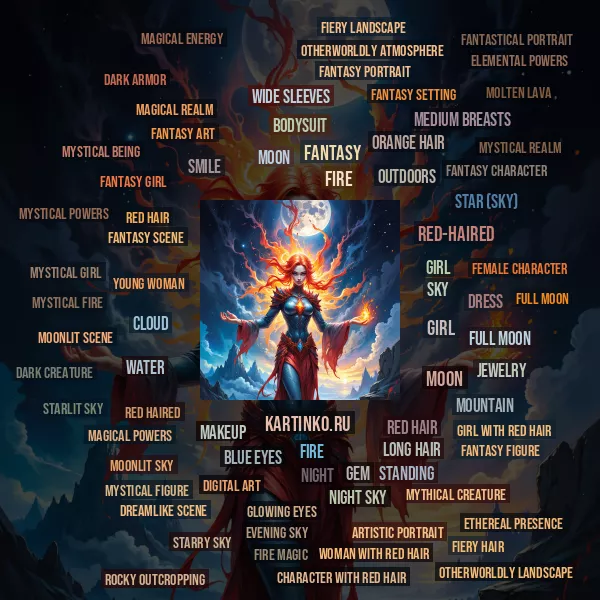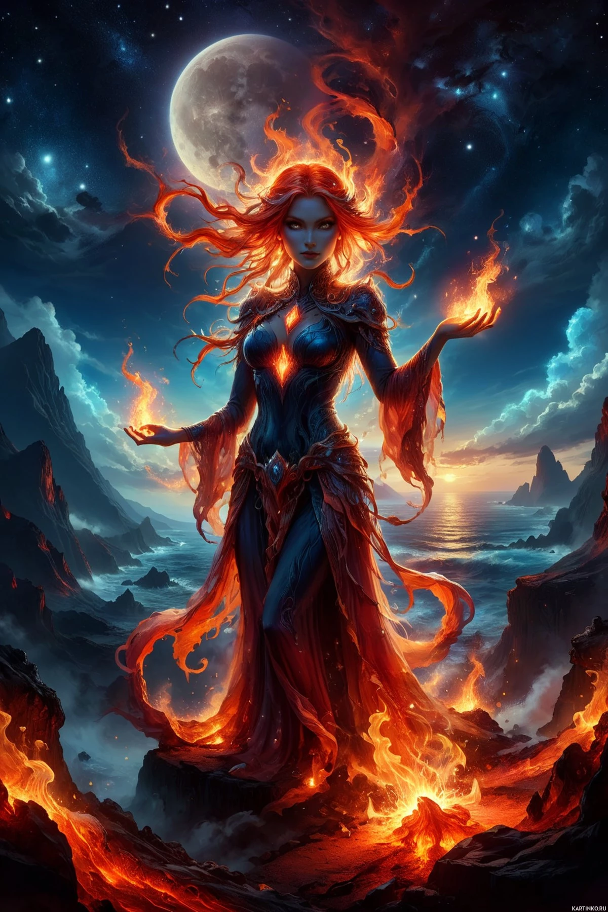 a dark armor and robes with flame patterns, which adds to the mystical and fiery theme. Behind her,