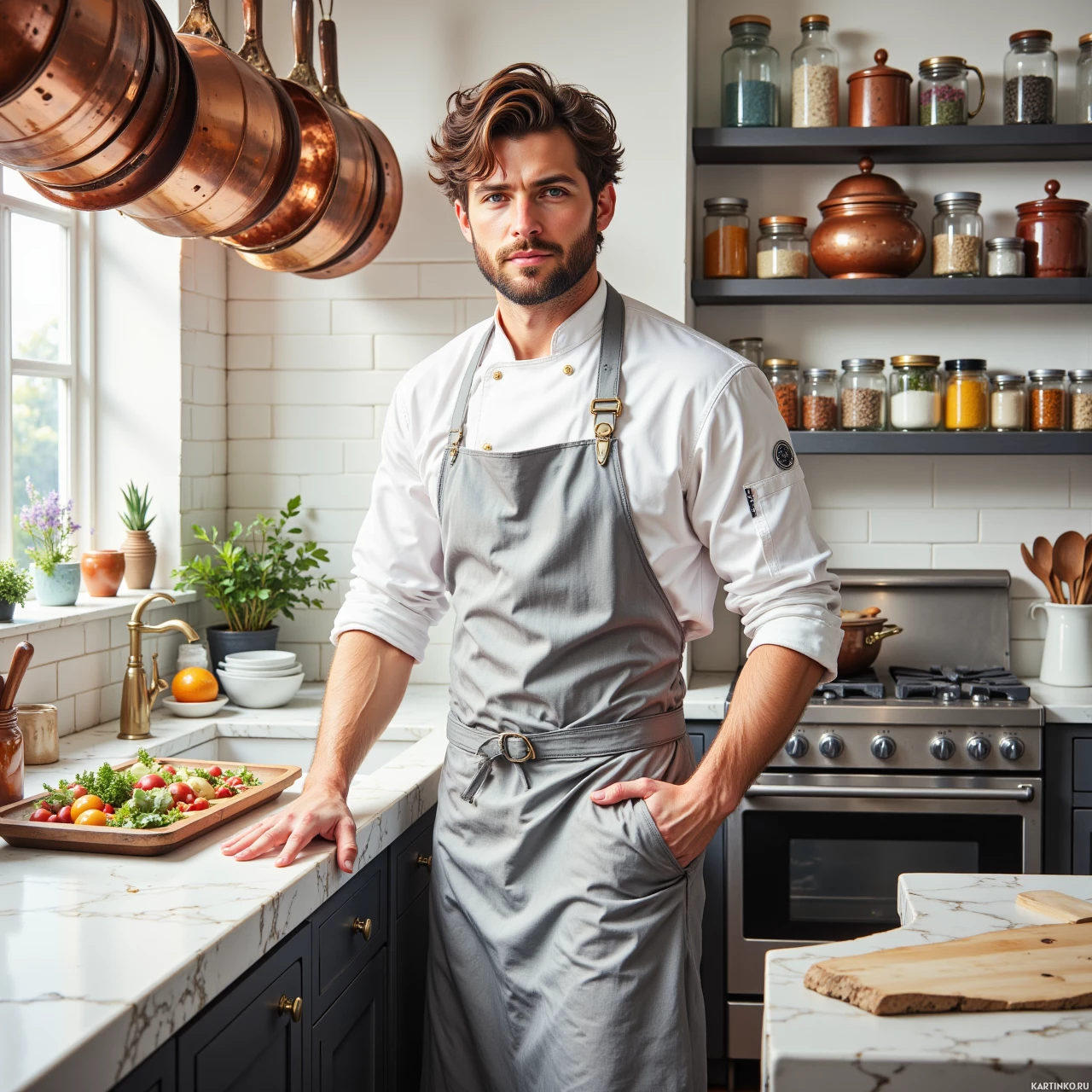 На картинке изображён мужчина, стоящий на кухне. На нём поварской костюм: белый фартук и чёрная футболка с надписью «Chef». Он стоит непринуждённо, руки засунув в карманы. На кухонном столе перед ним — подборка свежих продуктов, среди которых, похоже, овощи и фрукты, например, морковь и апельсины. Кухня оформлена в индустриальном стиле, с металлическими элементами и современным дизайном. На заднем плане – полки с банками, вероятно, с травами или другими кулинарными принадлежностями. Освещение мягкое и тёплое, возможно, это день, судя по естественному свету, проникающему через окна, которых нет в кадре. Картинка выполнена в профессиональном стиле, возможно, для рекламы продуктов или кулинарных услуг.