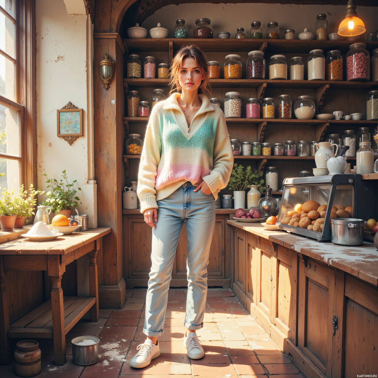 На картинке изображен человек, стоящий перед старинной кухней или кладовой. На полках позади него – различные банки и контейнеры с разными содержимым, вероятно, ингредиенты для выпечки или готовки. На столе лежат какие-то вещи, среди которых, кажется, выпечка – пирожные или булочки. Человек одет в повседневную, домашнюю одежду: уютный свитер поверх лонгслива и джинсы. Комната пронизана атмосферой старины и винтажа, словно она является частью старого здания или заведения.