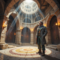 На картинке изображен человек, стоящий в центре, по всей видимости, архитектурного пространства, возможно, интерьера с арочными дверями и богатым декором, что указывает на историческую или сказочную тематику. На нем одежда в стиле эпохи, что может намекать на персонажа из прошлого или действие, происходящее в давние времена. Теплый свет освещает части комнаты, создавая драматичные тени и блики на стенах и полу. Общая композиция картинки передает ощущение загадочности и может быть связана с темами истории, приключений или открытий.