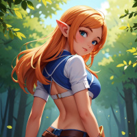 a blue top with what appears to be some form of badge or emblem on the left shoulder, suggesting she might have a role in her fantasy setting that involves authority or adventure. She is also adorned with a sword at her side, indicating she could be a warrior or