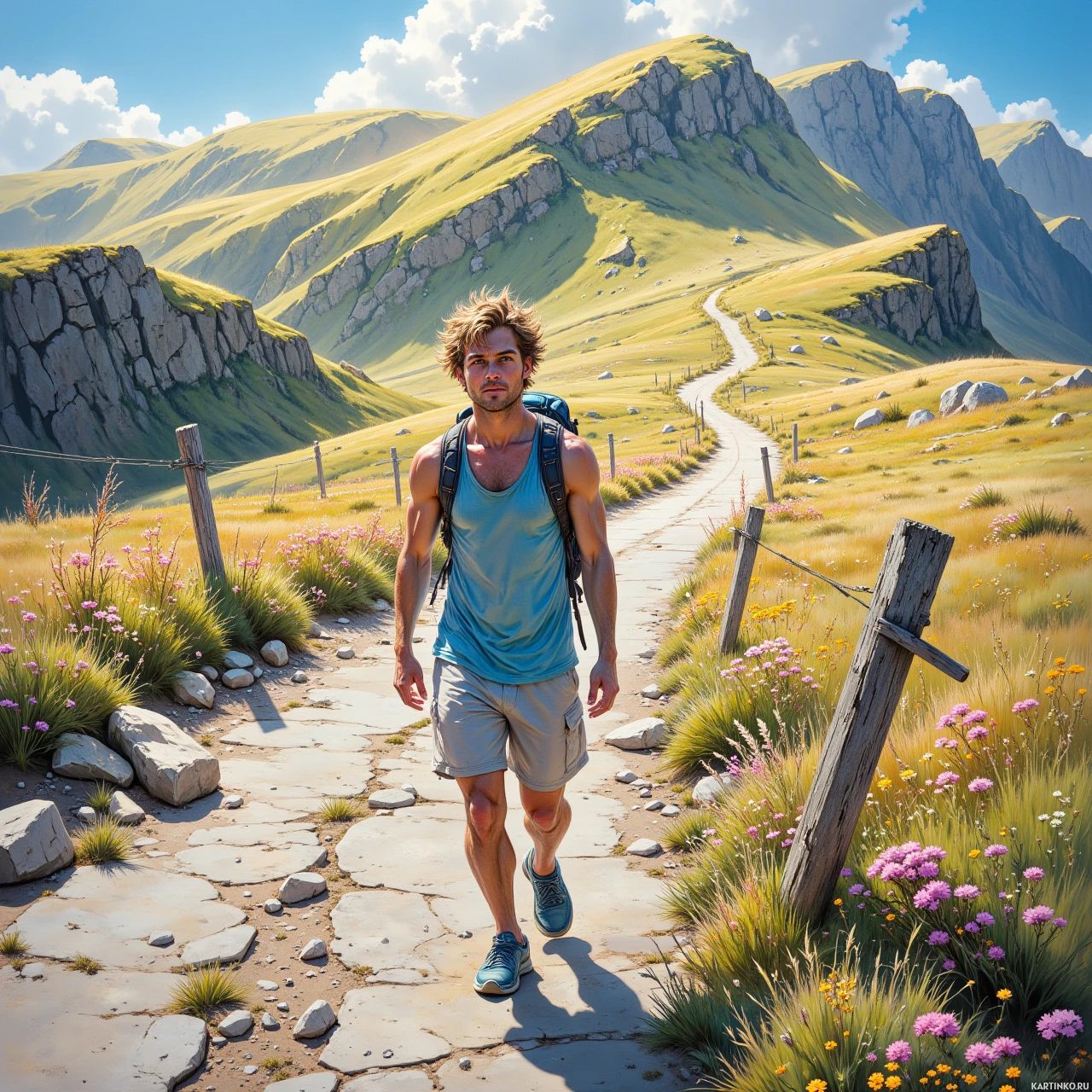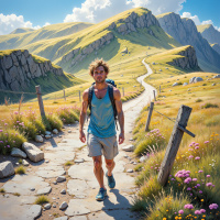 На картинке запечатлен мужчина, идущий по тропе среди скал и буйной зелени, что говорит о горной местности. Он одет в майку и шорты, удобные для активного отдыха, через плечо перекинут рюкзак. На заднем плане возвышаются величественные горы, что позволяет предположить, что он находится в Альпах или в похожей географической области, известной своими пешеходными маршрутами и живописными пейзажами. По его расслабленной позе и улыбке видно, что он получает удовольствие от похода.