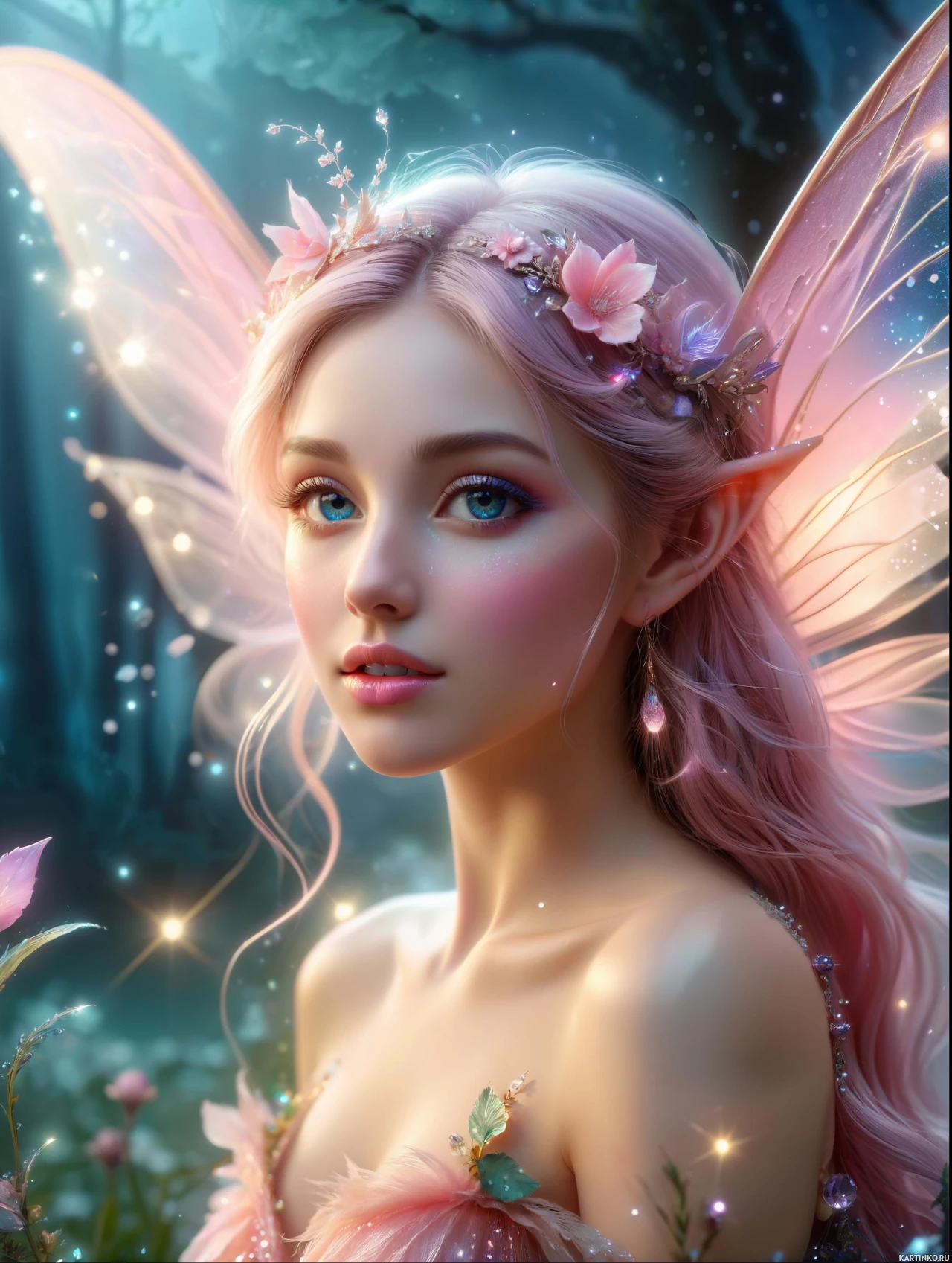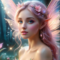 pink hair and is adorned with wings that resemble those of a butterfly or a fairy. Her attire includes