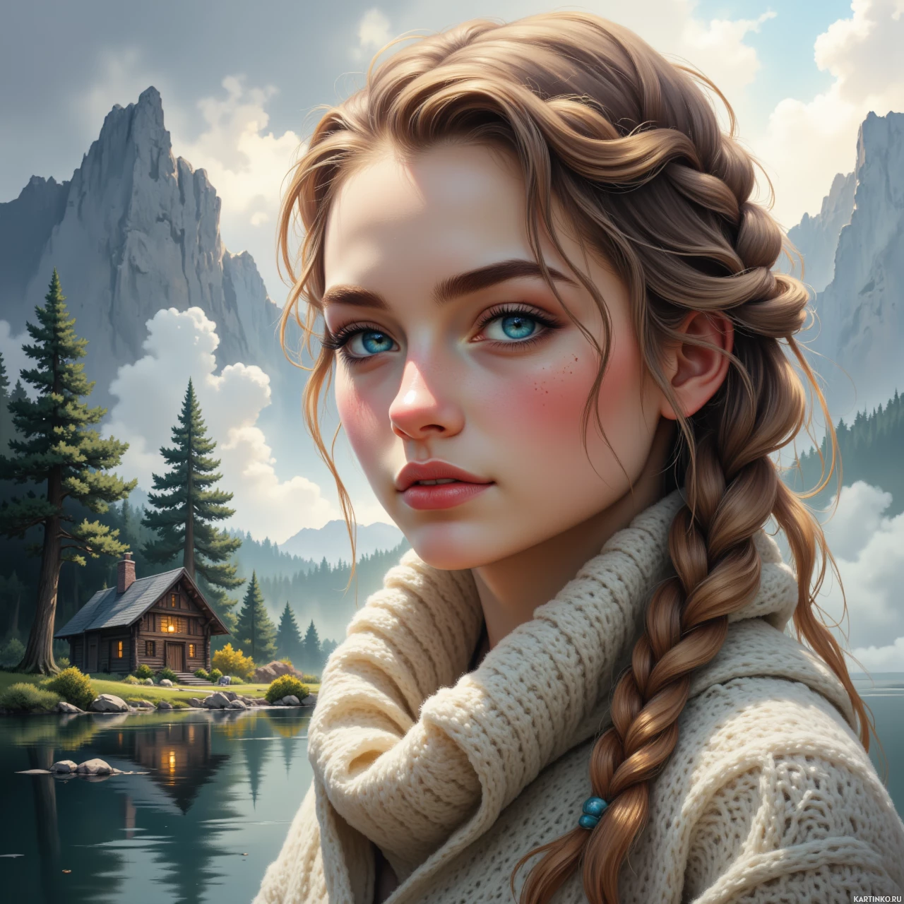 The image features a young woman with long hair styled in loose braids. She has light skin and her facial expression is neutral. Her eyes are light blue, and she has subtle pink coloring on her cheeks. She wears a cozy-looking beige sweater or cardigan over a cream-colored top. The backdrop of the image includes a peaceful woodland scene with a cabin nestled among trees in the background. A body of water reflects the surrounding landscape, enhancing the serene atmosphere.