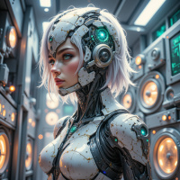 The image features a humanoid figure with robotic enhancements. The central figure has a metallic frame, predominantly white in color, with detailed mechanical and circuit-like patterns that give it an organic yet artificial appearance. There are various electronic components integrated into the head and neck area, suggesting advanced technology or cybernetic integration. The eyes have glowing blue lights, possibly indicating a visual interface or digital processing capabilities. The mouth is subtle, not overly expressive but still functional within the design of the face. The hair appears to be a blend of white and light grey, which could imply advanced age in human terms or simply be part of the robot's design. The background consists of panels with glowing lights and what seem to be electronic display screens. These elements contribute to an atmosphere that is consistent with science fiction themes. The overall style of the image suggests a blend of organic and artificial, possibly hinting at advanced technology or human-robot interaction in a futuristic setting.