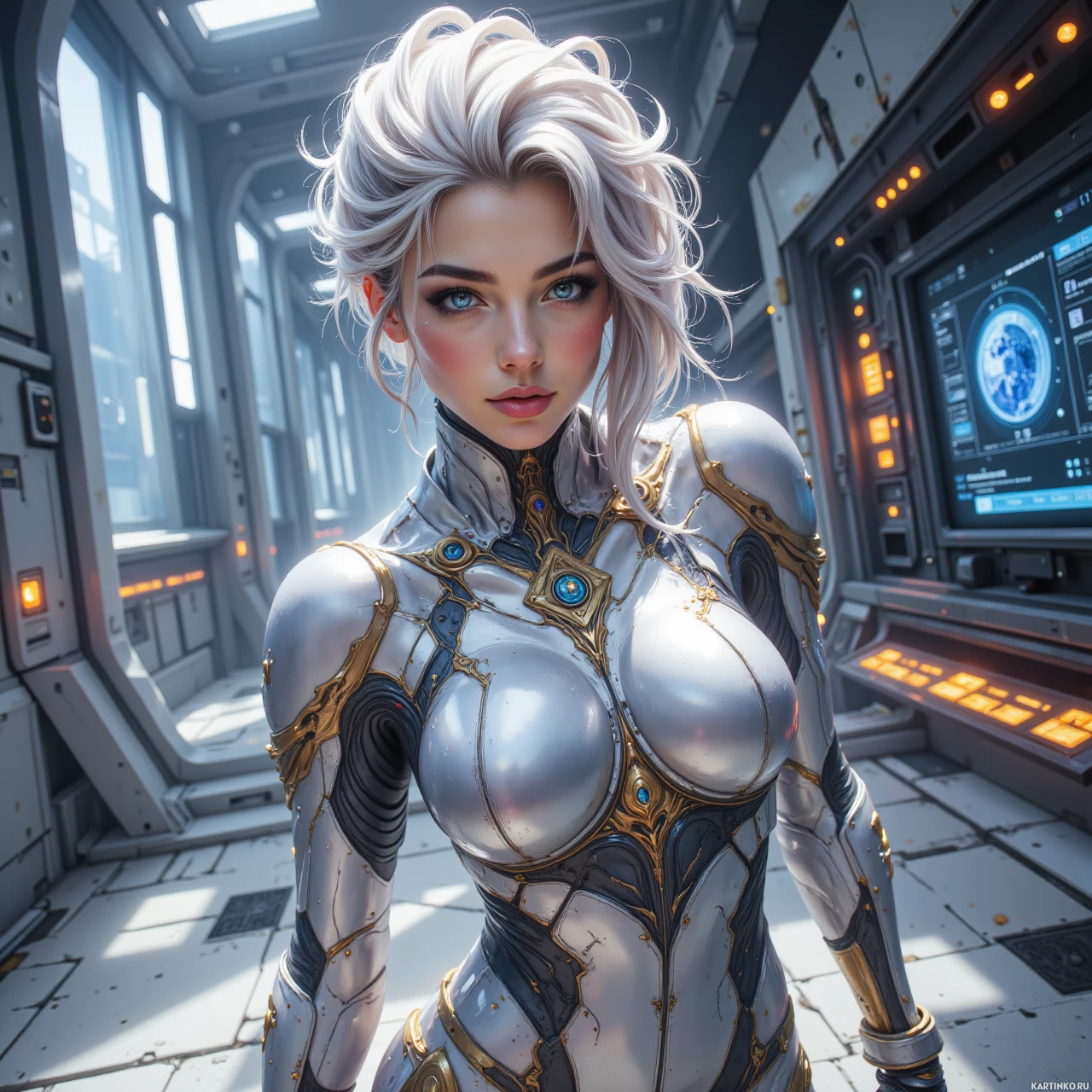 На картинке на переднем плане выделяется молодая девушка. У неё белые волосы, ниспадающие на плечи и до груди. Её глаза голубые, и она смотрит прямо в камеру с нейтральным выражением лица. Она одета в футуристический доспех преимущественно серебряного цвета, который выглядит одновременно функциональным и стильным. Доспех включает в себя наплечники и нагрудник со сложной отделкой. Вокруг неё видны цифровые дисплеи и интерфейсы, что предполагает, что она находится в технологически продвинутой среде. Задний план представляет собой индустриальное пространство с металлическим полом и трубами, что создает научно-фантастическую атмосферу сцены.