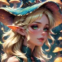 the whimsical nature of her attire. She has a delicate and elegant appearance, enhanced by the jewelry she is adorned with. The background includes mushrooms that suggest a fantasy