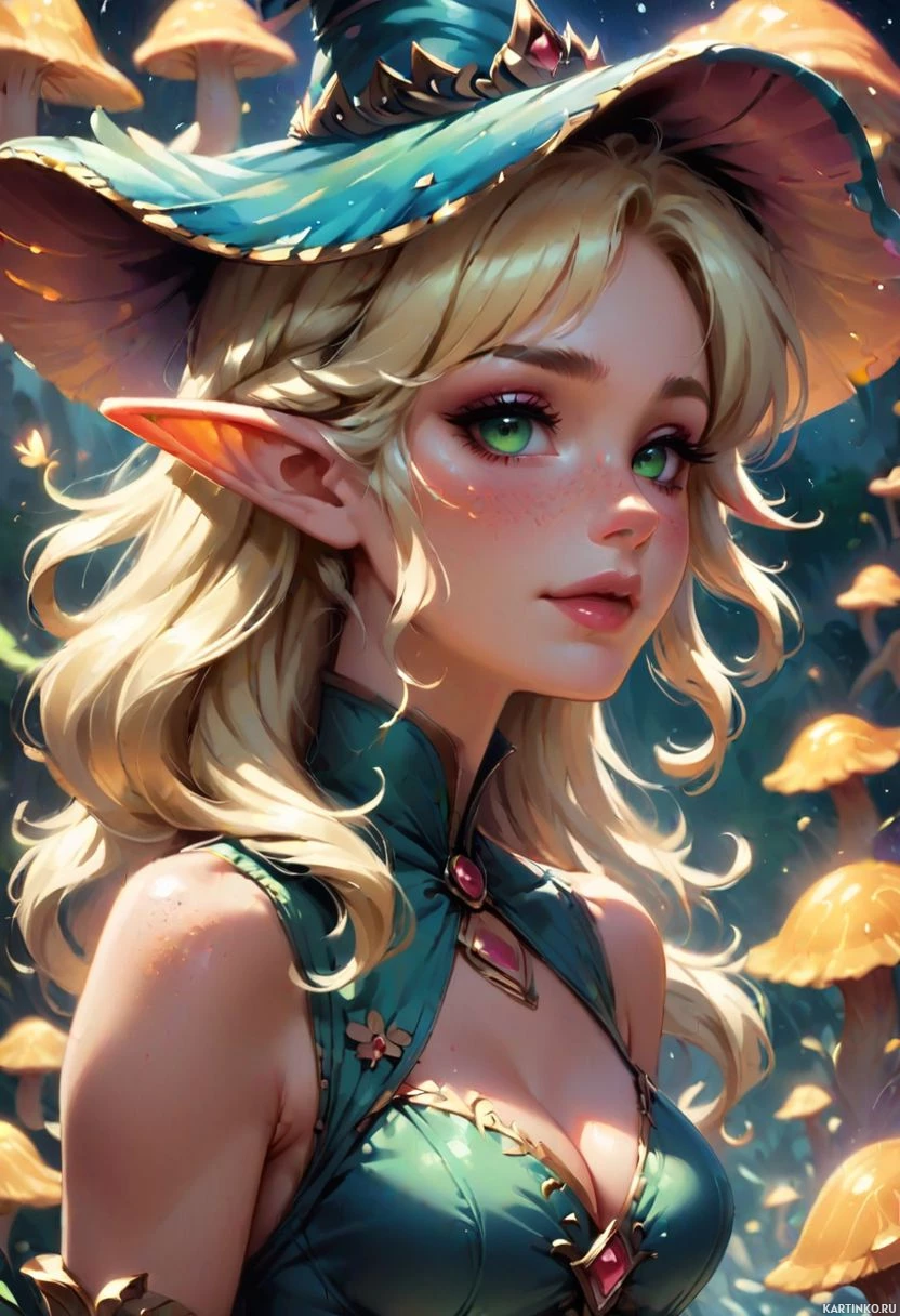 blonde hair and striking green eyes that stand out against her fair skin. Her ears are pointed like typical fantasy representations of elves. The elf is wearing a hat with what seems to be a feather or a plume on top, adding to