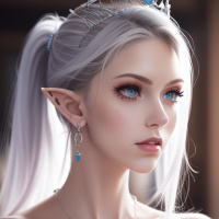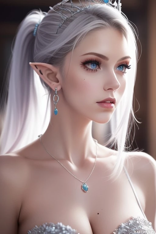 white hair and features typical of fantasy art, such as pointed ears. She is adorned with jewelry including what appears to be
