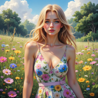 A young woman with light blonde hair stands in a field of flowers. She wears a floral print dress and her gaze is directed slightly upward, towards the camera. The sky behind her is clear and blue.